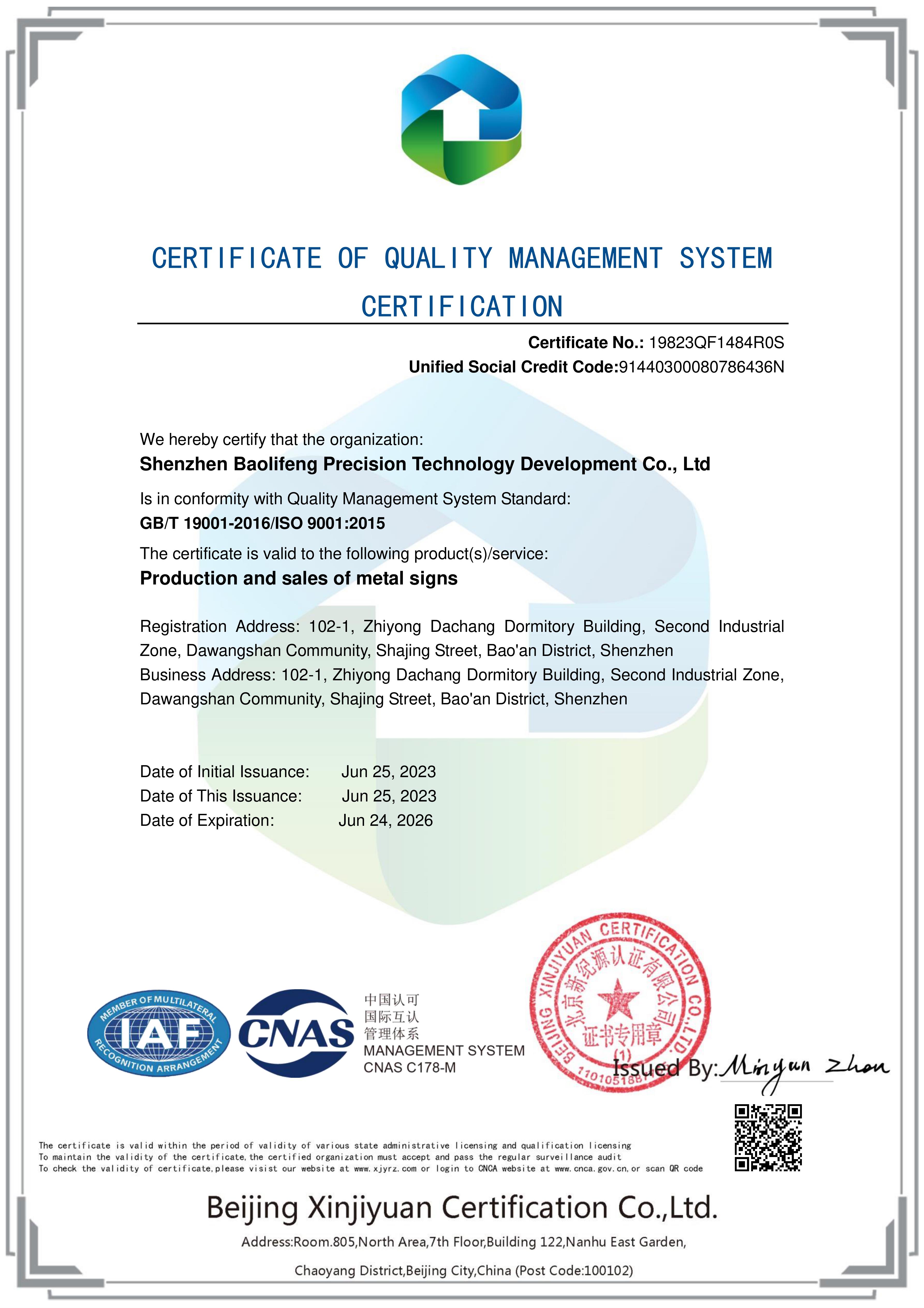 公司獲得金屬標牌生產質量管理體系認證證書