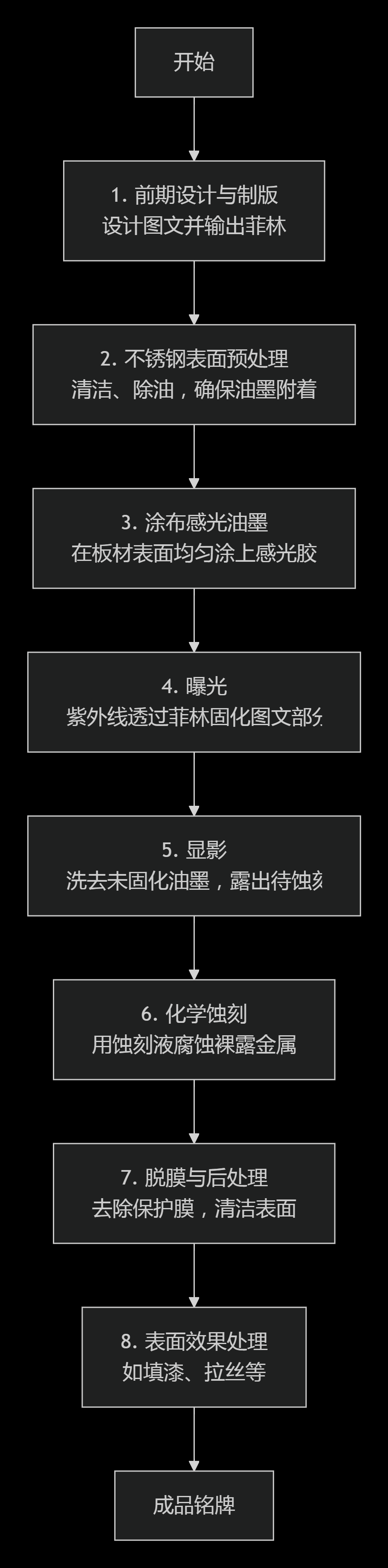 下面這張流程圖可以幫你直觀地了解不銹鋼銘牌蝕刻的整個制作過程: